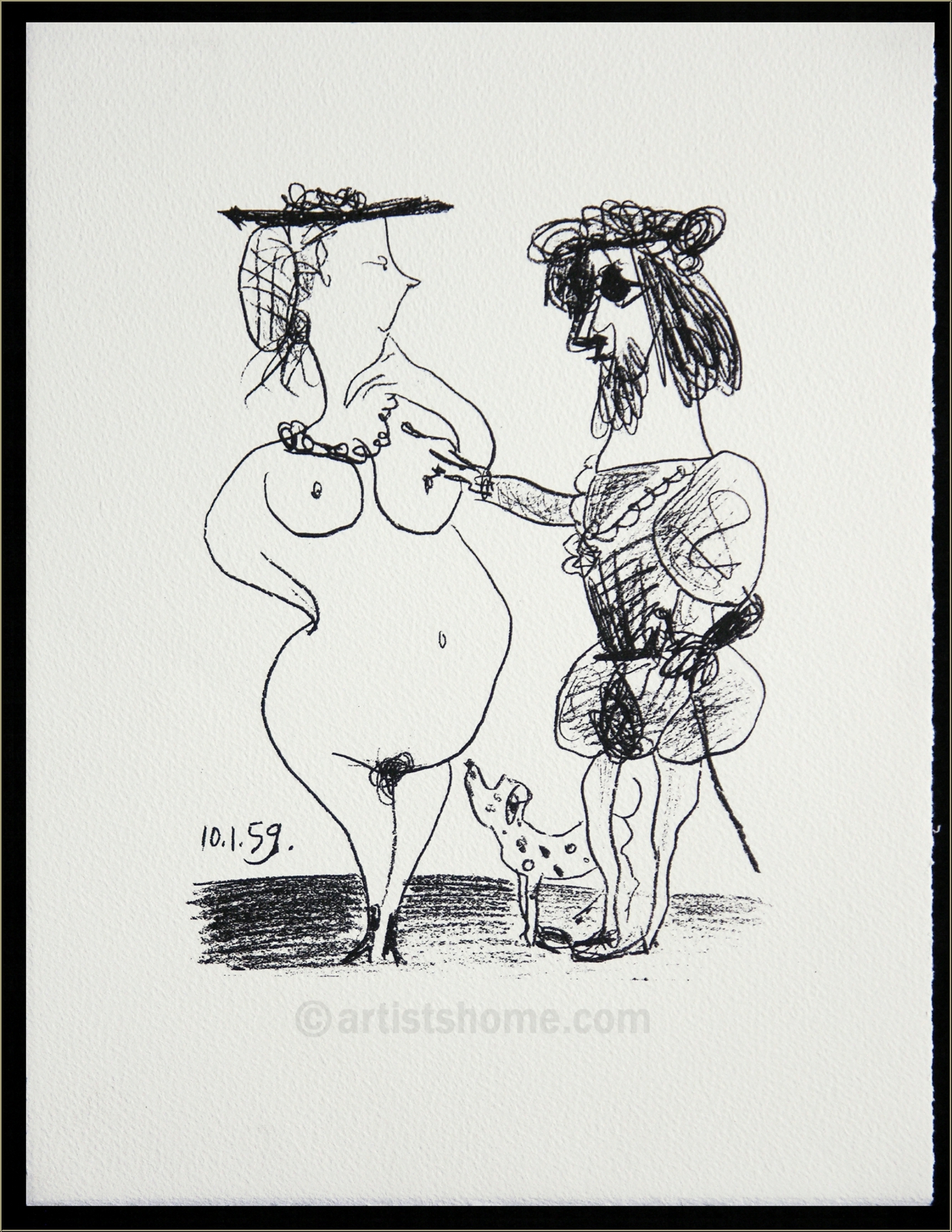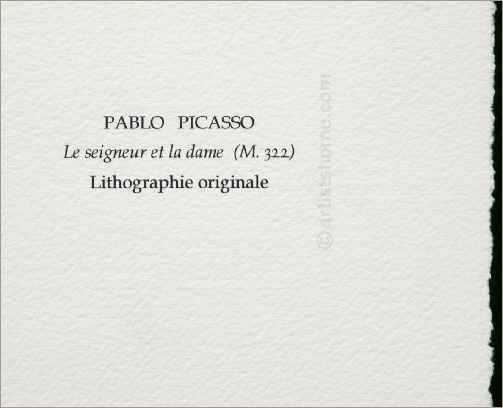 | | "Le seigneur et la dame" (Der Edelmann und die Dame) Picasso arbeitete diesen köstlich-frechen Steindruck in Schwarz bereits im Jahr 1959, er wurde jedoch als alleinige Auflage erstmals im Jahr 1972 gedruckt. Eine der seltenen Original-Lithographien Picassos, die damals in Fernand Mourlots berühmtem Portfolio "Souvenirs et portraits d'artistes" veröffentlicht wurde. Eines der 800 Exemplare befindet sich auch im Fine Arts Museums of San Francisco. Dies ist KEINE später gedruckte Kaufhaus-Massenware (Kunstdruck wie z.B. Grano- oder Offset-Lithographie), sondern die Original-Lithographie für die Vorzugsausgabe von Mourlots Buch über sein Lebenswerk. ACHTUNG: aktuell werden im Netz identisch aussehende Drucke angeboten - hierbei handelt es sich um gefälschte Nachdrucke (Raubkopien). Diese Grafiken sind KEINE Original-Lithographien, auch wenn sie auf der Rückseite mit "Lithographie originale" bedruckt und für den Laien kaum zu unterscheiden sind! | Auflage: | Eines von 800 unsignierten Exemplaren für die Vorzugsausgabe, in der Platte datiert "10.1.1959". | | Größe: | 32,5 x 25 cm (Blattgröße) | | Verleger: | Alain C. Mazo, Paris u. Léon Amiel, New York, 1972 | | Anmerkung: | Rücks. typografisch bezeichnet: Pablo Picasso - Le seigneur et la dame (M.322) - Lithographie originale. | Werkverzeichnis/ Referenz: | [1] Mourlot, Fernand. Picasso Lithograph. André Sauret, Paris 1970, S. 258, Nr. 322 [2] Picasso, Pablo: Die illustrierten Bücher. Kupferstichkabinett Basel. Gerd Hatje Verlag, 1995, S. 194, Nr. 153. Sie erhalten mit der Lieferung den vollständigen Auszug aus den o.g. Werkverzeichnissen, sowie einen Identitätsnachweis (ohne Preisangabe, falls das Blatt verschenkt werden soll). Außerdem erhalten Sie eine Kopie der Impressumseite mit der Nummerierung aus der Originalkassette zu Ihrem Blatt. | | | Dieses Blatt wird durch unseren Geschenk-Service verpackt Kundenbewertungen Bisher wurde noch keine Bewertung abgegeben. Bewertungen können nur von Kunden geschrieben werden, die den Artikel gekauft haben und eingeloggt sind. Ihre persönlichen Daten werden automatisch anonymisiert (Beispiel: "Jens H., Deutschland").  *Gültig für Lieferungen nach Deutschland bei Zahlung per PayPal. Bei Zahlung per Banküberweisung verlängert sich die Lieferzeit um 1-3 Tage ab dem Tag, an dem Sie überwiesen haben. Lieferzeiten für andere Länder sowie Informationen zur Berechnung des Liefertermins finden Sie hier |
