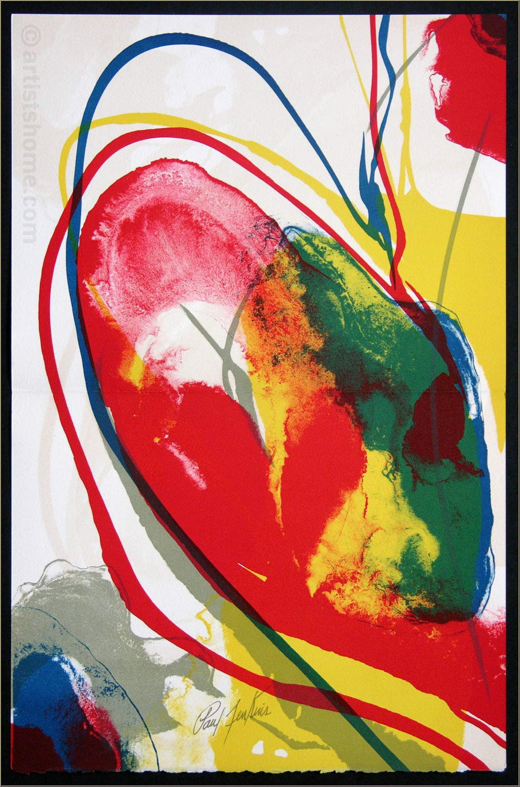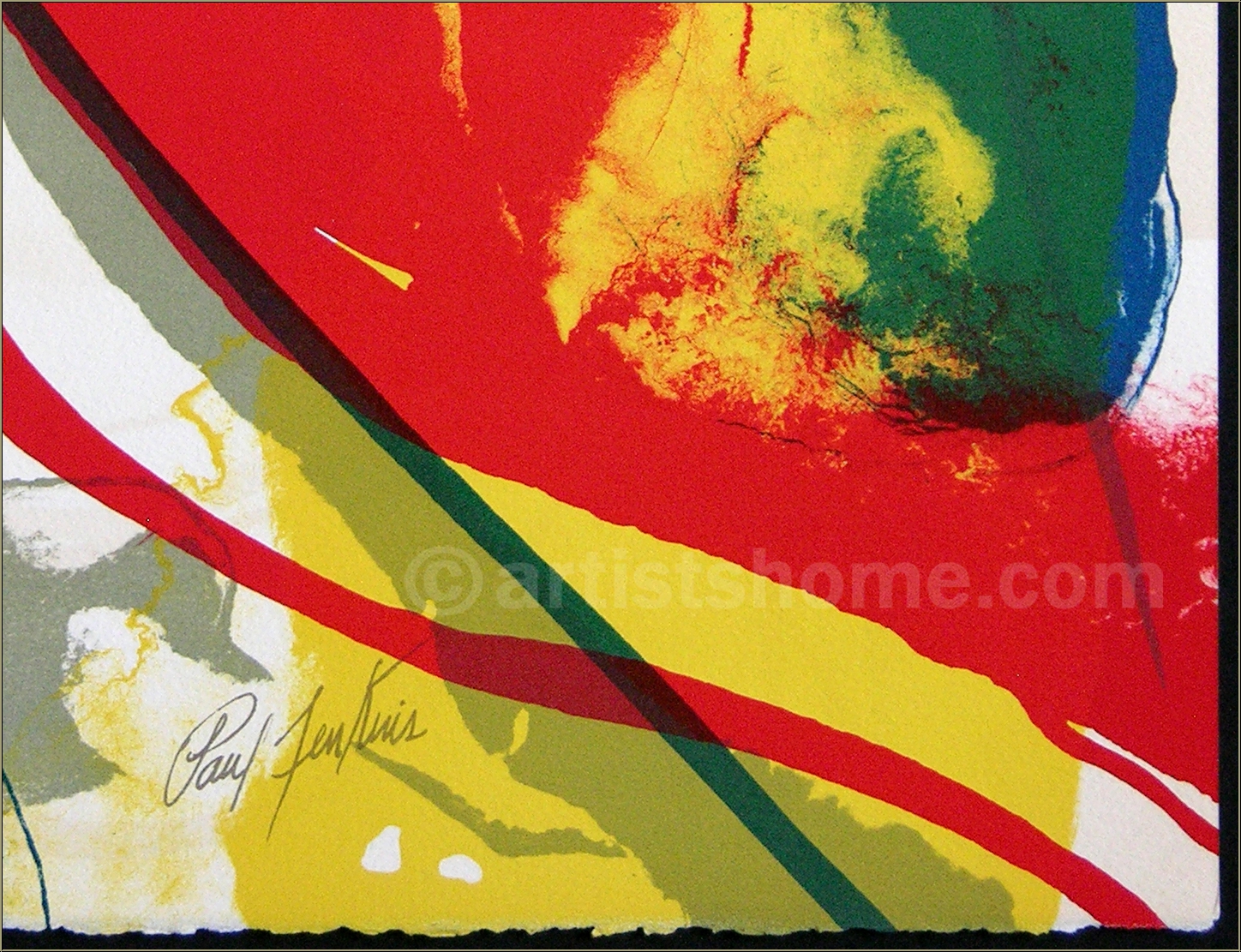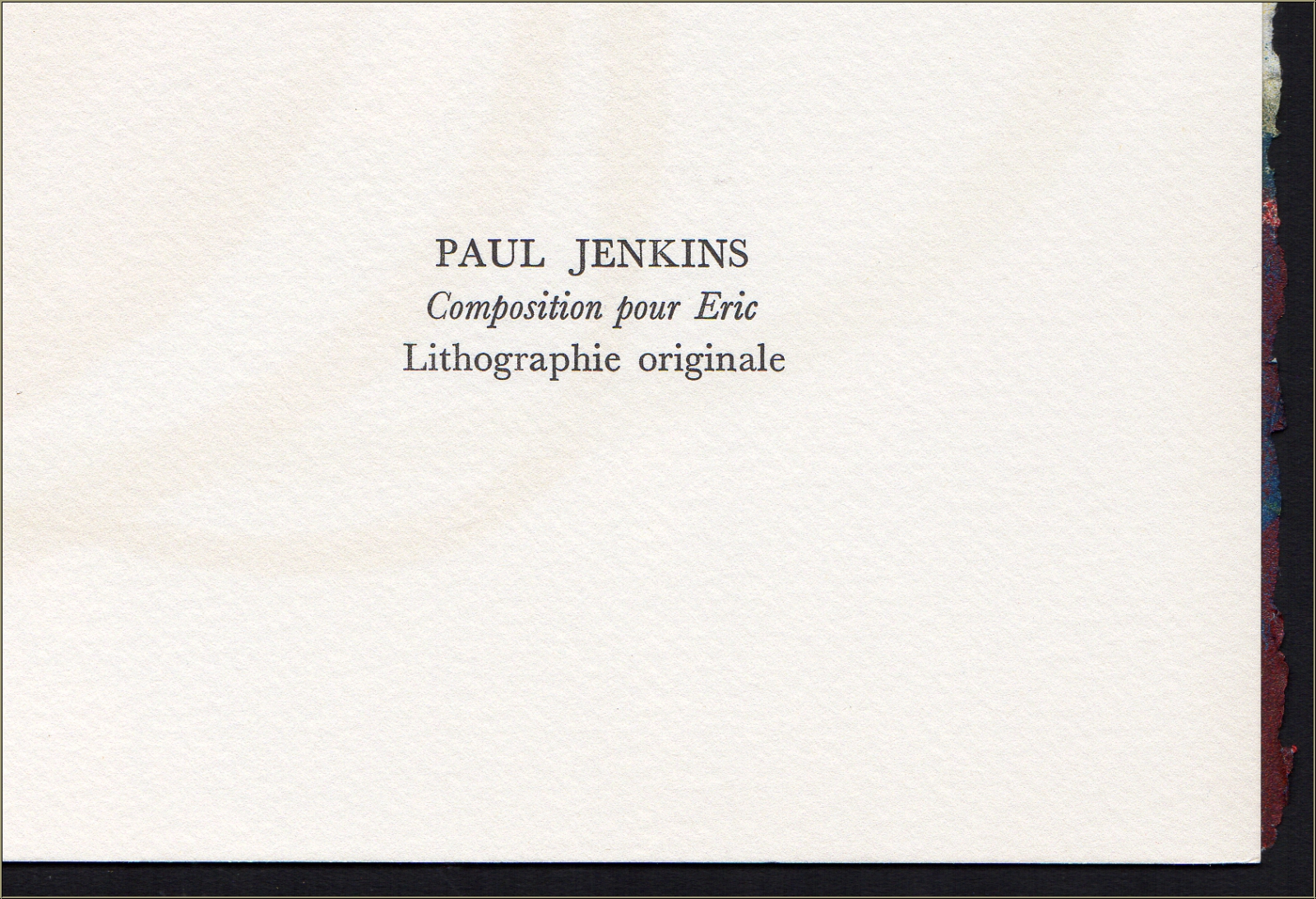 | | "Composition pour Eric" - 1972 Wie eine Eizelle, in deren Innerem eine Frucht heranwächst, umgeben von schützenden Hüllen in den drei Grundfarben Rot, Gelb und Blau - dieser spontanen Wahrnehmung kann man sich kaum entziehen. Wer auch immer "Eric" war, er muss eine nachdrückliche Bedeutung für Paul Jenkins gehabt haben. Dieses Werk war der Beitrag des US-amerikanischen Künstlers zu einem aufwändig illustrierten Band, mit dem der Meisterdrucker und -lithograph Fernand Mourlot seiner langjährigen Zusammenarbeit mit den ganz Großen der zeitgenössischen Kunst gedachte. Einige von ihnen, darunter Braque, Matisse, Villon und Giacometti, lebten bei Erscheinen des Portfolios bereits nicht mehr, andere - wie Picasso - starben kurz darauf. Souvenirs et portraits d'artistes gilt deshalb als Vermächtnis des begnadeten Handwerkers und Verlegers. | Künstler: | Paul Jenkins *1923 Kansas City, USA - †2012 New York City, USA | | Technik: | Original-Farblithographie (Steindruck, abgezogen bei Mourlot), im Stein signiert Dies ist KEINE später gedruckte Massenware (Kunstdruck wie z.B. Grano- oder Foto-Lithographie), sondern die Original-Lithographie aus der Vorzugsausgabe von Fernand Mourlots Buch über sein Lebenswerk. ACHTUNG: aktuell werden identisch aussehende Drucke im Internet für kleines Geld angeboten - hierbei handelt es sich um unauthorisierte, spätere Nachdrucke (Raubkopien). Diese Grafiken sind keine Original-Lithographien! | | Jahr: | 1972 | | Größe: | 50 x 32,5 cm (Blattgröße), mit dem üblichen Mittelfalz, wie erschienen | | Auflage | Papier: | Eines von 800 unsignierten Exemplaren auf dickem Arches Bütten. Rückseitig typografisch bezeichnet: "Paul Jenkins - Composition pour Eric - Lithographie originale" | | Verleger: | Alain C. Mazo, Paris u. Léon Amiel, New York, 1972 | | Druck: | Mourlot, Paris | Werkverzeichnis/ Referenz: | Verweis: https://mourlot.com: "Livres de Fernand Mourlot" (in französischer Sprache) Sie erhalten mit der Lieferung einen Identitätsnachweis (ohne Preisangabe, falls das Blatt verschenkt werden soll). Außerdem erhalten Sie eine Kopie der Impressumseite mit der Nummerierung aus der Originalkassette zu Ihrem Blatt. | | Zustand: | Erläuterungen hierzu Makelloses Exemplar aus dem Archiv. In diesem Zustand selten! Lieferung ohne Rahmen. | Dieses Blatt wird durch unseren Geschenk-Service verpackt Kundenbewertungen Bisher wurde noch keine Bewertung abgegeben. Bewertungen können nur von Kunden geschrieben werden, die den Artikel gekauft haben und eingeloggt sind. Ihre persönlichen Daten werden automatisch anonymisiert (Beispiel: "Jens H., Deutschland").  *Gültig für Lieferungen nach Deutschland bei Zahlung per PayPal. Bei Zahlung per Banküberweisung verlängert sich die Lieferzeit um 1-3 Tage ab dem Tag, an dem Sie überwiesen haben. Lieferzeiten für andere Länder sowie Informationen zur Berechnung des Liefertermins finden Sie hier |