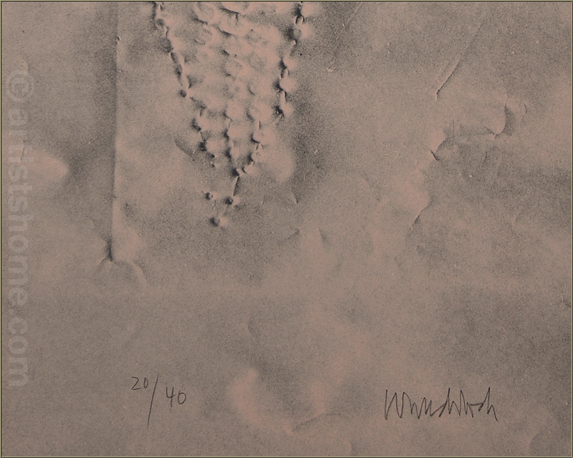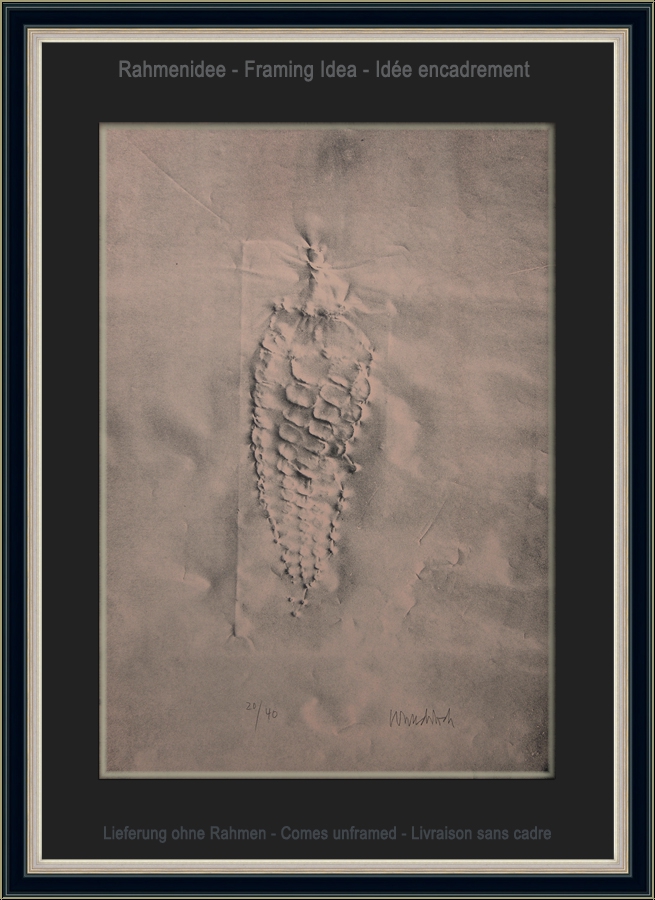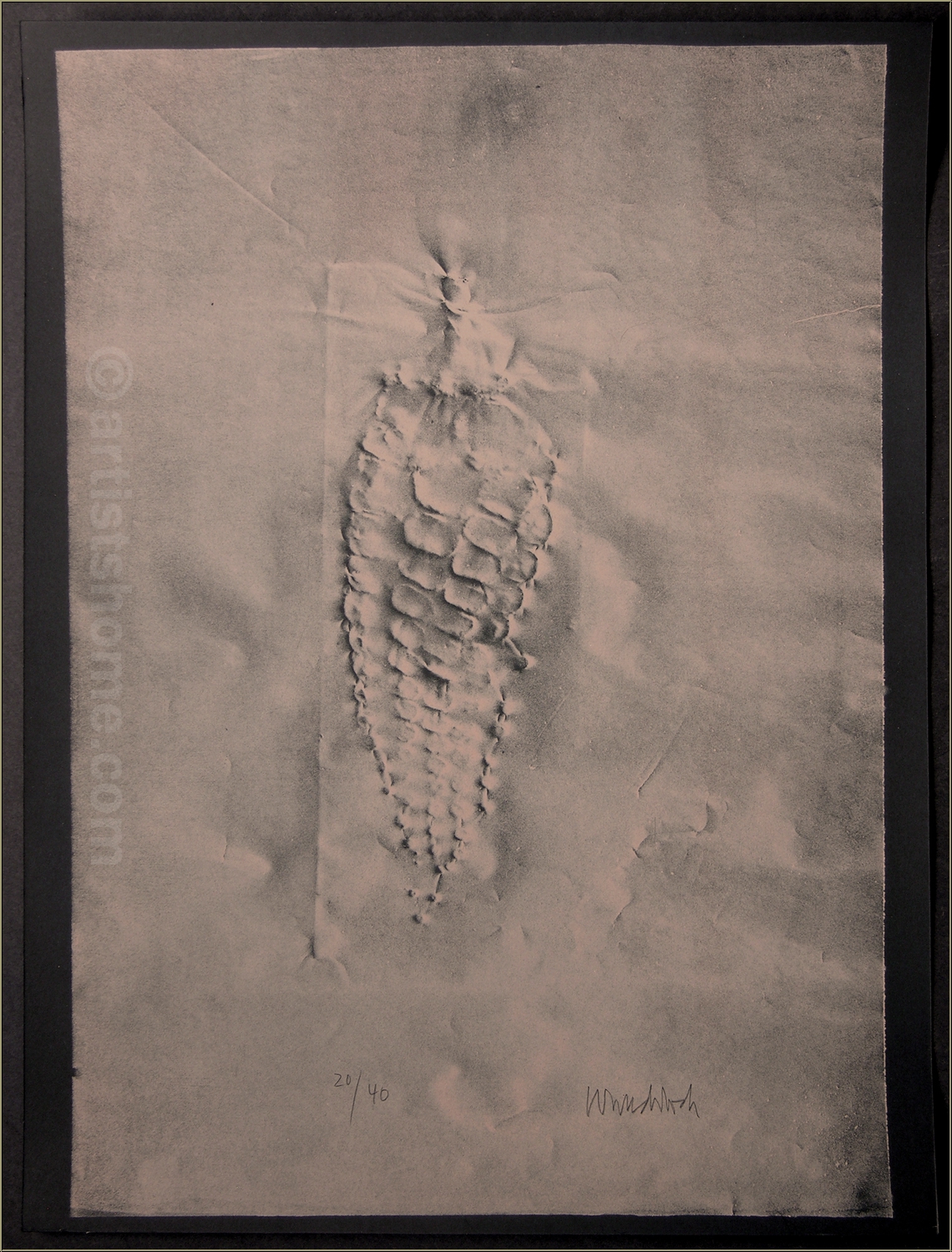 1972 war Wunderlichs "Fossilien- bzw. Archäologiejahr", in dem er mit Hilfe der Umdrucktechnik mehrere Lithographien mit Abbildungen vermeintlich versteinerter Objekte arbeitete. Die Darstellung der Stücke hat er dabei als positive Reliefs konzipiert: hier eine Ananas, zusammengeschrumpft auf die Form einer geschuppten Peperoni, die sich unter kupferfarbenem Packpapier abzuzeichnen scheint - echt wirkende Knitterfalten inbegriffen.