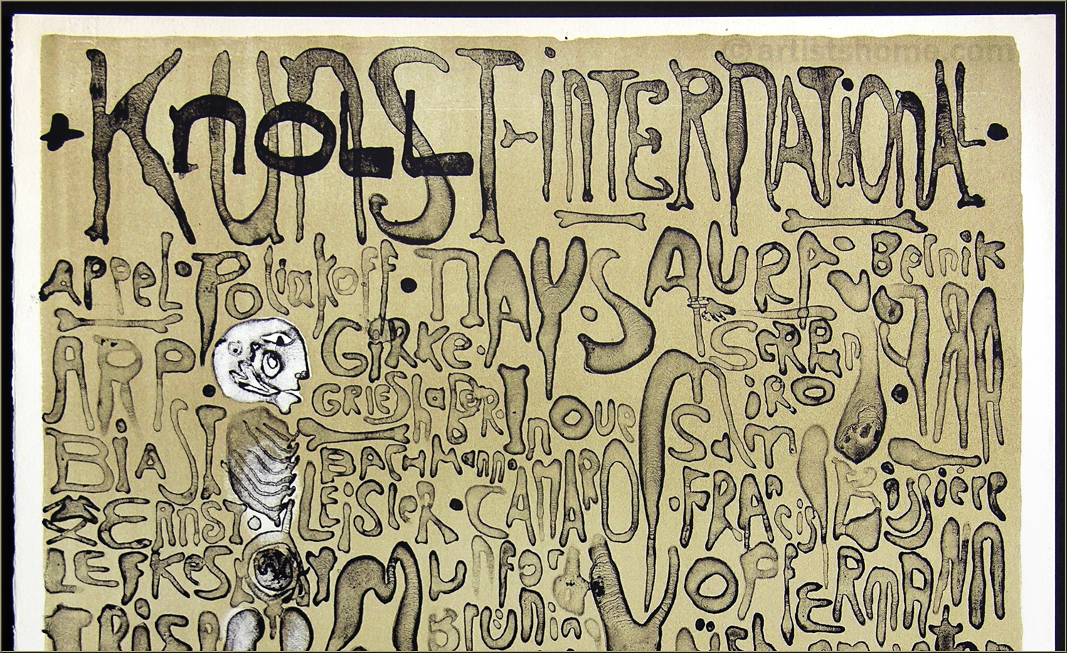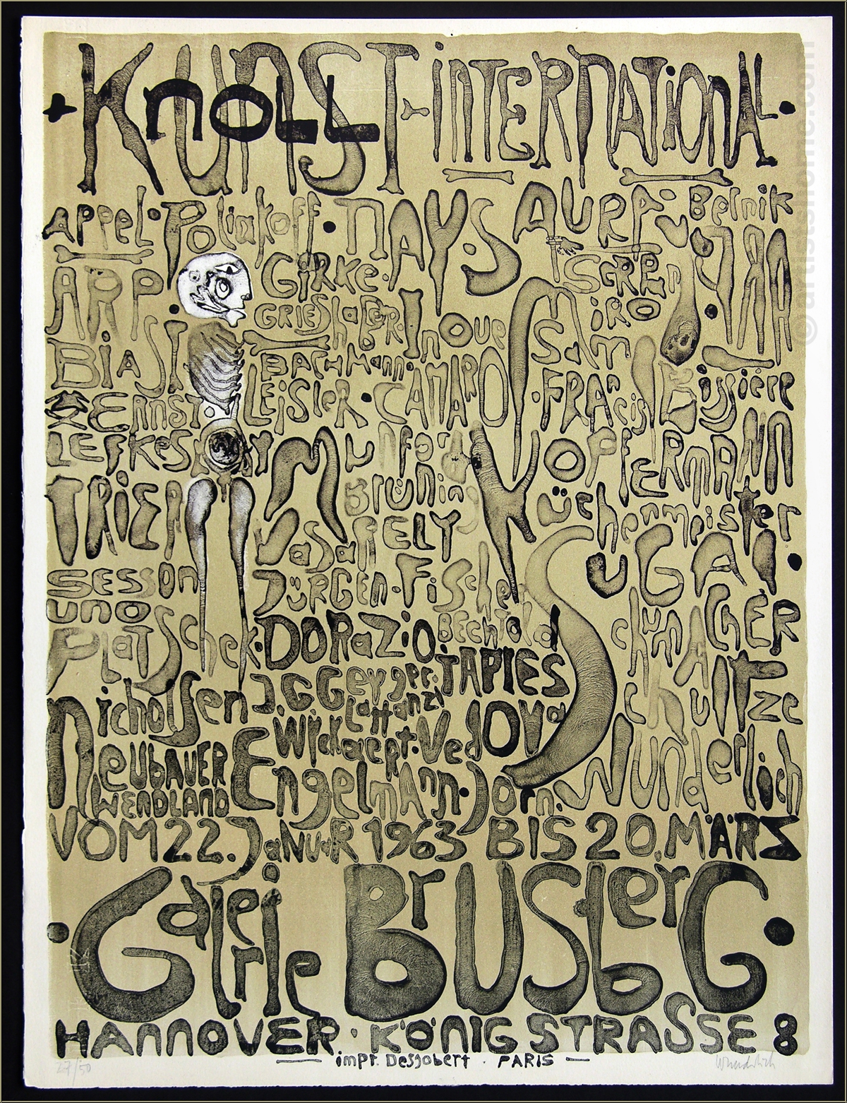Nicht selten ging Paul Wunderlich in seinen frühen druckgrafischen Werken einem "lesenswerten" Hobby nach - dem der künstlerischen Typografie. Für dieses seltene Originalplakat zu einer Ausstellung von KNOLL Kunst (heute Knoll.art) 1963 in der Galerie Brusberg zeichnete Wunderlich seine Buchstaben als skurril geformte Körperteile, erkennbar an der hautartigen Oberflächenstruktur samt Poren und Runzeln. Dass er dabei im Eifer des Gefechts in mindestens einen Namen der im Plakat aufgelisteten, vertretenen Künstler einen Schreibfehler bastelte, scheint seinerzeit niemandem aufgefallen zu sein.