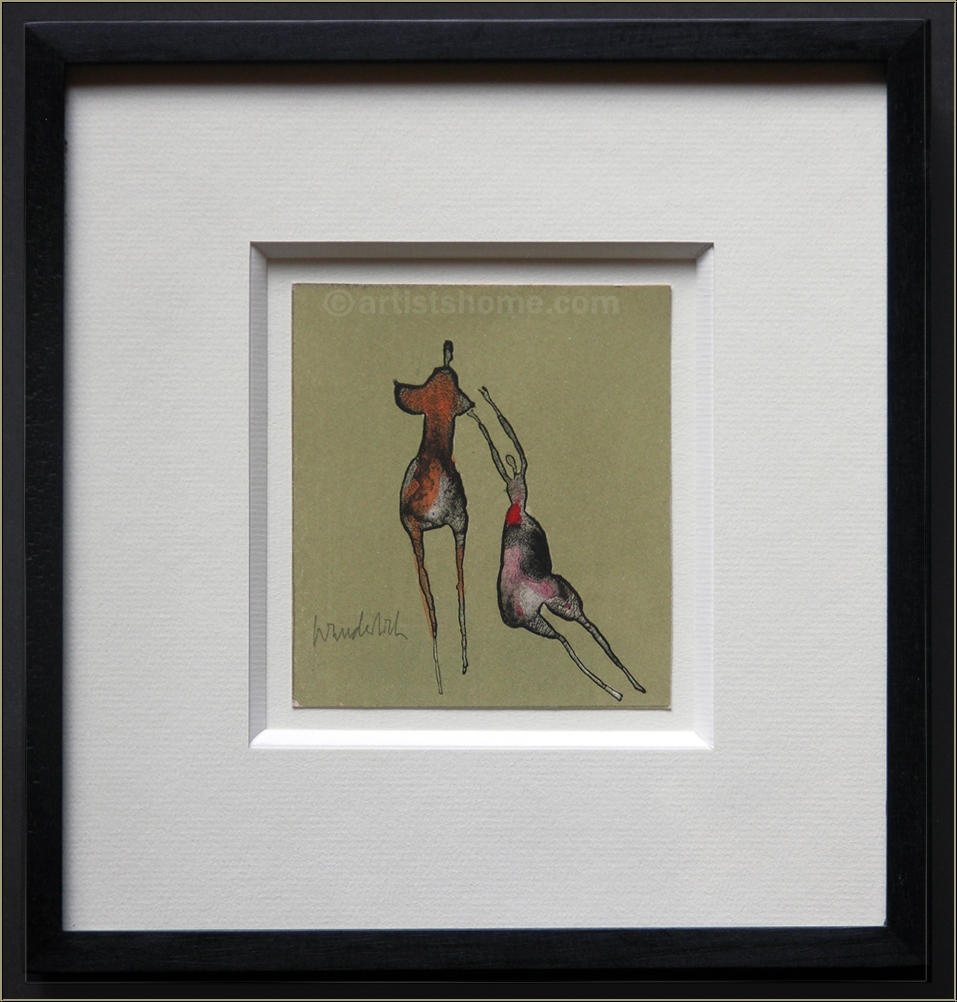 Eine weibliche und eine männliche Figur, getreu dem "System Wunderlich" in irgendeine Form von Geschlechterkampf involviert, sind die Protagonisten dieser vom Künstler per Hand kolorierten Lithographie aus seinem "Skizzenbuch" von 1962. Es exisitieren 12 Abzüge dieses Motivs, alle mit unterschiedlichen Überarbeitungen. Unser Blatt wurde ausgesprochen hochwertig gerahmt, in einem schlichten, maßgefertigten, schwarzen Galerierahmen aus Holz, und in ein extrem voluminöses Passepartout montiert.