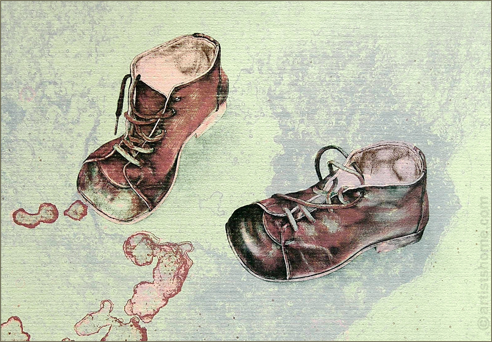 "Kinderspiel" - Unikat: Braune Kinderschuhe vor hellgrauem Hintergrund auf blassgrünem Bütten