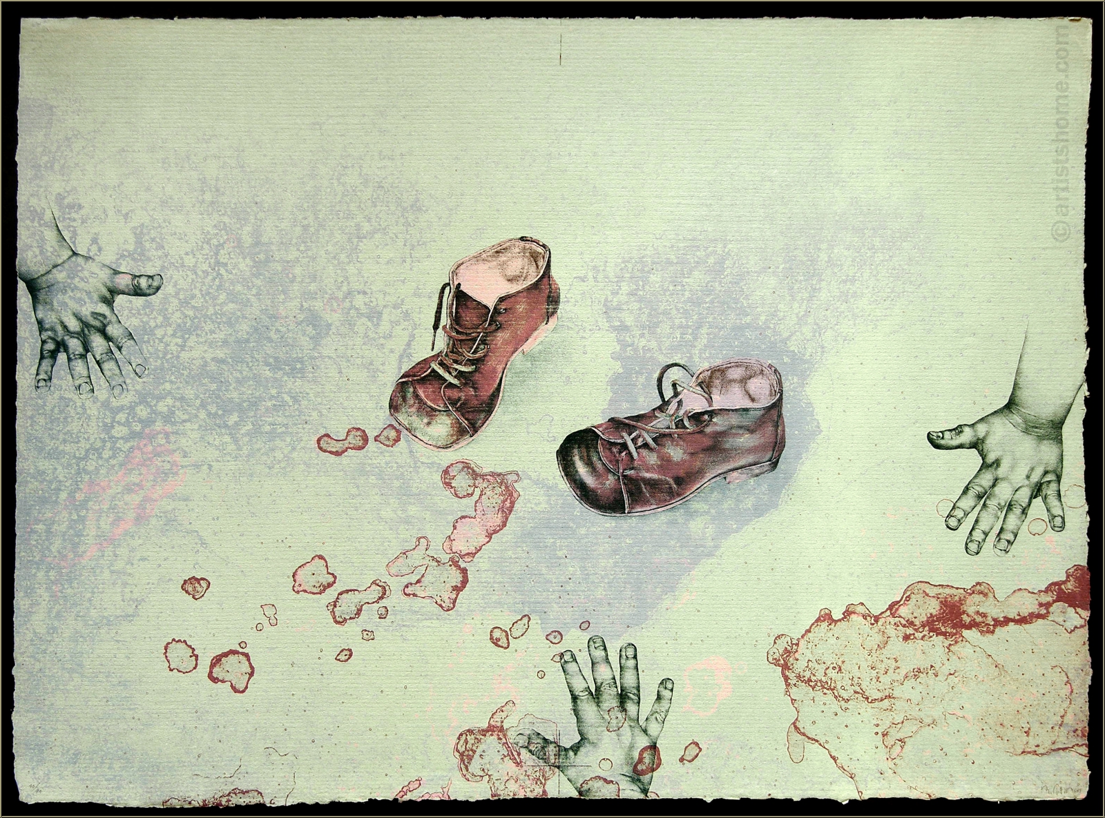 Reiner Schwarz: Schuhe eines Kleinkindes und drei Kinderhände, nachdenkliche Arbeit des Berliner Künstlers