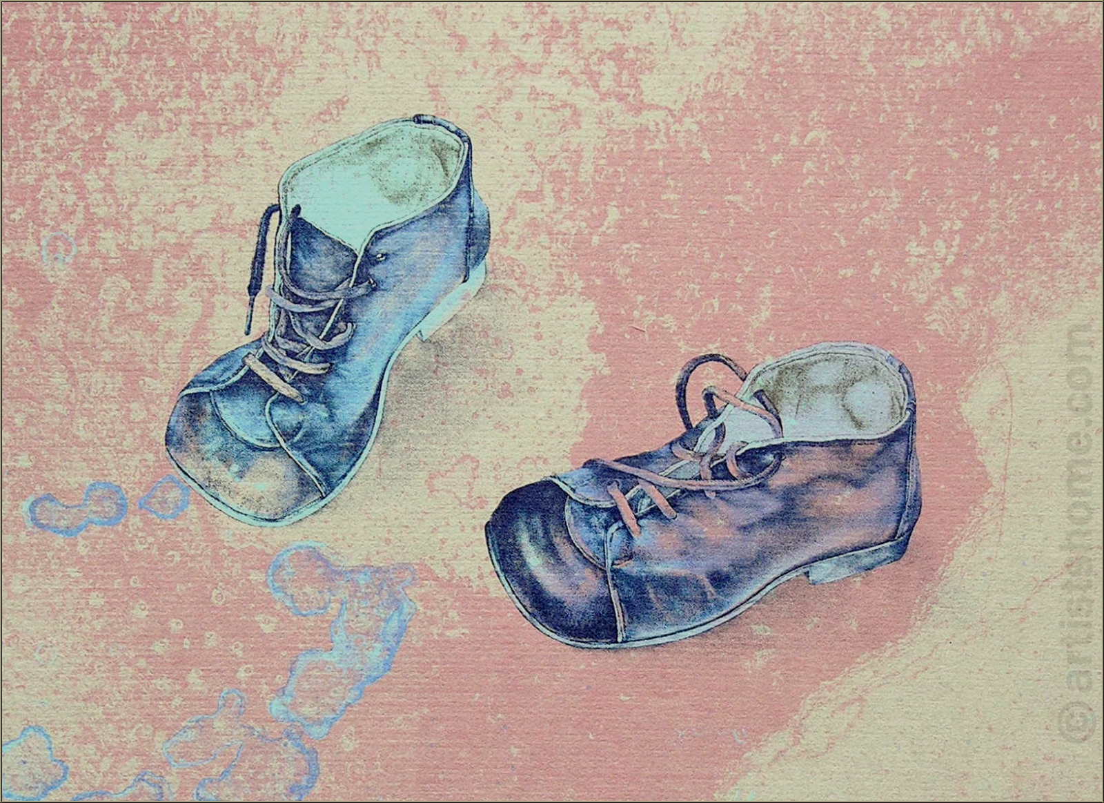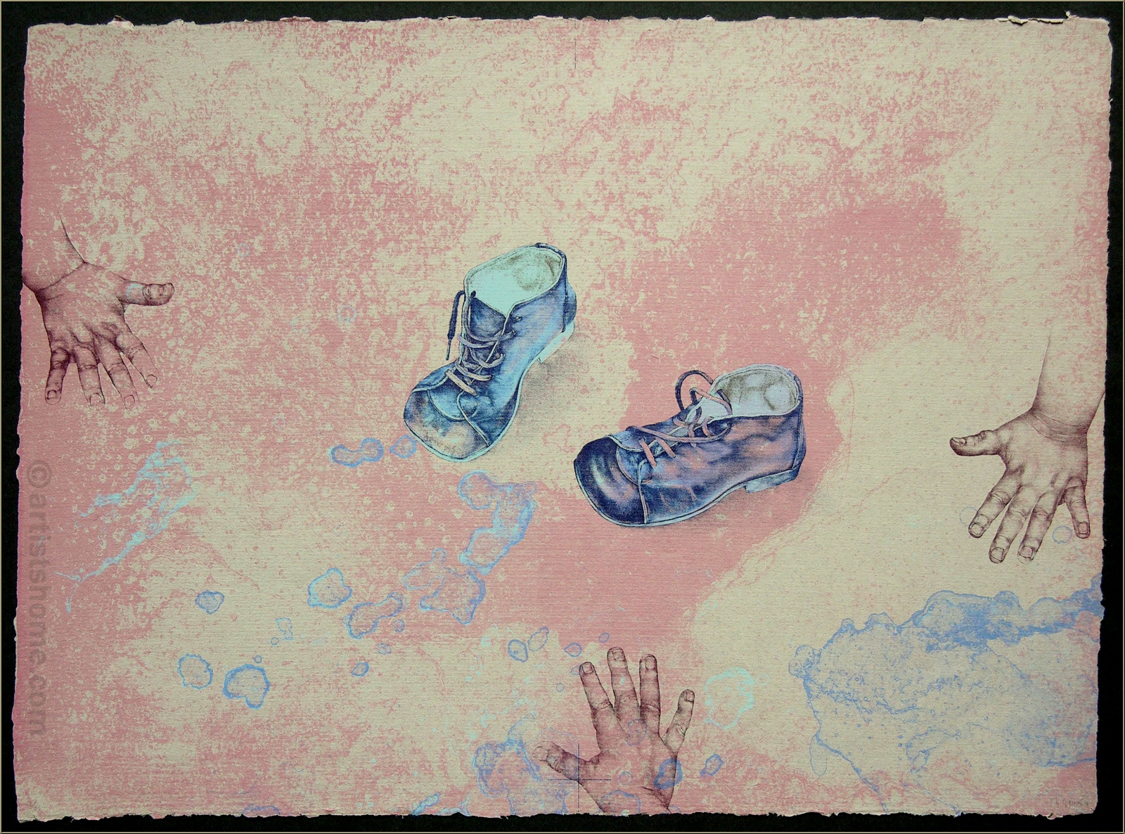 "Kinderspiel" - Unikat: Blaue Kinderschuhe vor Rosa auf pastellbraunem Bütten
