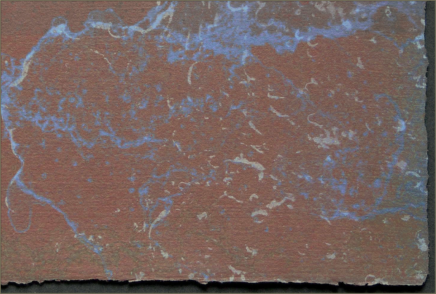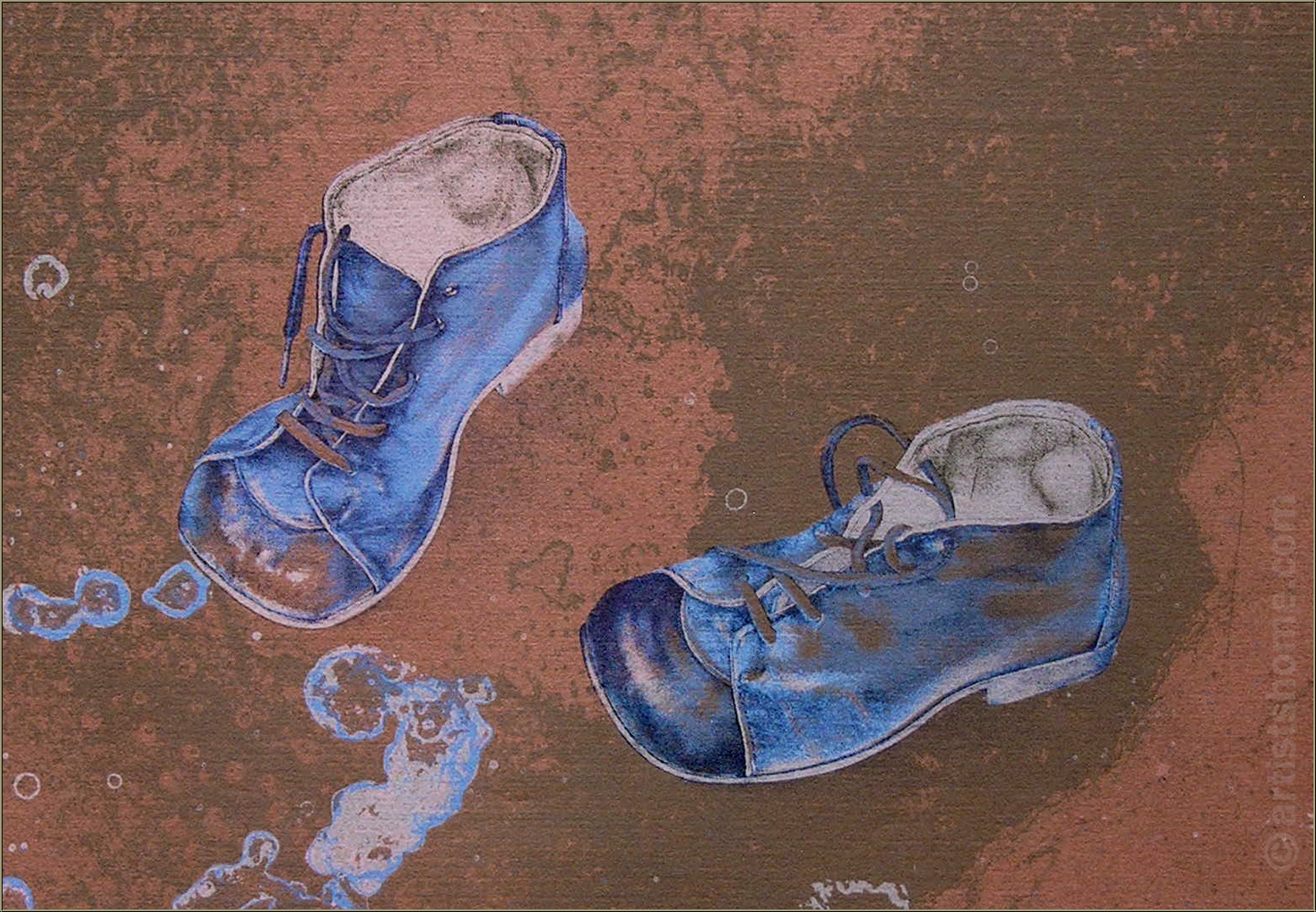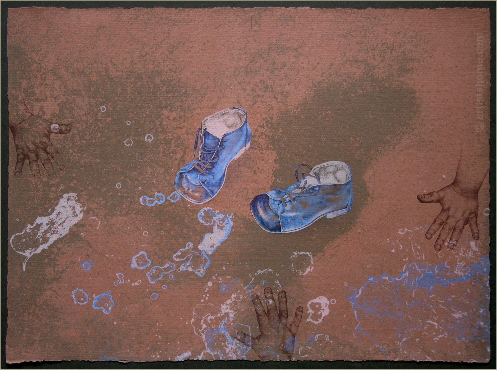 Details:"Kinderspiel" - Unikat: Blaues Paar Kinderschuhe vor braunem Hintergrund auf ziegelrotem Bütten Mit dieser aus 81 Unikaten bestehenden Kinderschuh-Serie hob Reiner Schwarz 1974 seine eigene Druckwerkstatt in Berlin Kreuzberg aus der Taufe. Dass er sich gleich zu Anfang ein so komplexes Druckprojekt vornahm, kommt einem experimentierfreudigen Befreiungsschlag gleich, mit dem sich der Künstler aus den Zwängen der bis dato genutzten Hochschulpresse löste. Diese bemerkenswerte Grafikserie wurde von Reiner Schwarz mit sechs Platten in wechselnden Farben auf insgesamt neun verschiedenfarbige Papiere als Unikatauflage gedruckt - jede Farbvariante existiert also nur ein Mal. Als Druckträger verwendete er ein handgeschöpftes, fein geripptes Büttenpapier von Fabriano Italia, mit deren Roma-Wasserzeichen der Romulus und Remus säugenden Wölfin.