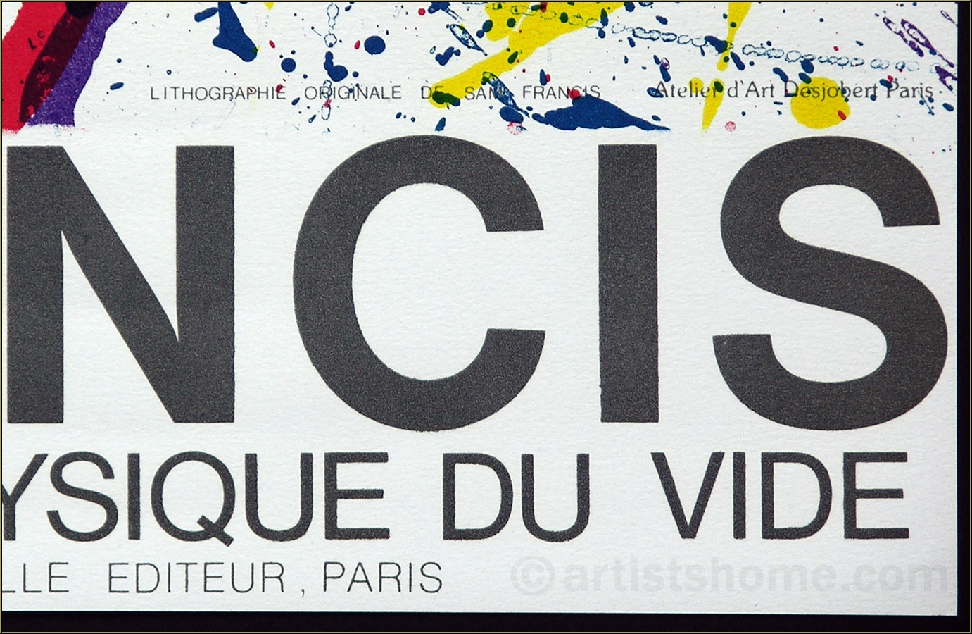 Dieses Originalplakat von 1986 auf Bütten wurde mit einer großformatigen Original-Farblithographie des Künstlers aus dem gleichen Jahr ausgestattet, mit der der Schriftsteller und Photograph Michel Waldberg auch sein Gedicht "Poème dans le ciel" in seinem damals neu erschienenen Werk über Sam Francis "Métaphysique du vide" illustrierte.