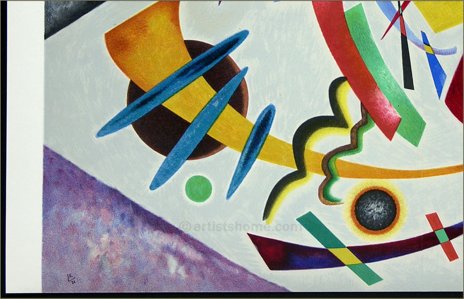 Das Bild, das als Vorlage für diese Farblithographie diente, war eines von nur 8 Werken, die Kandinsky im Jahr 1921 fertigstellte - kurz bevor er dann im Dezember sein selbstgewähltes Exil in Russland bzw. der neuen "Sowjetunion" in Richtung Berlin verließ, zusammen mit seiner Frau Nina.